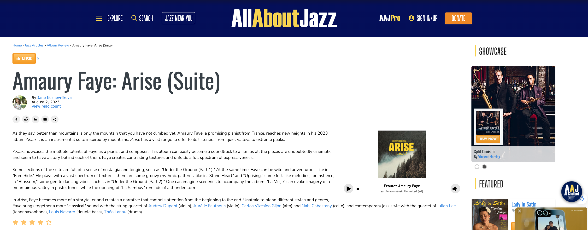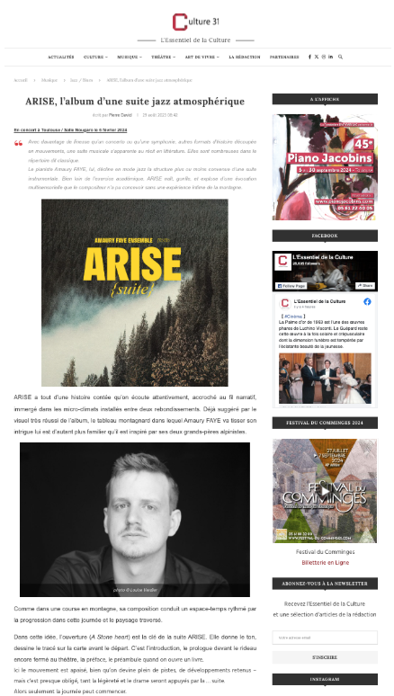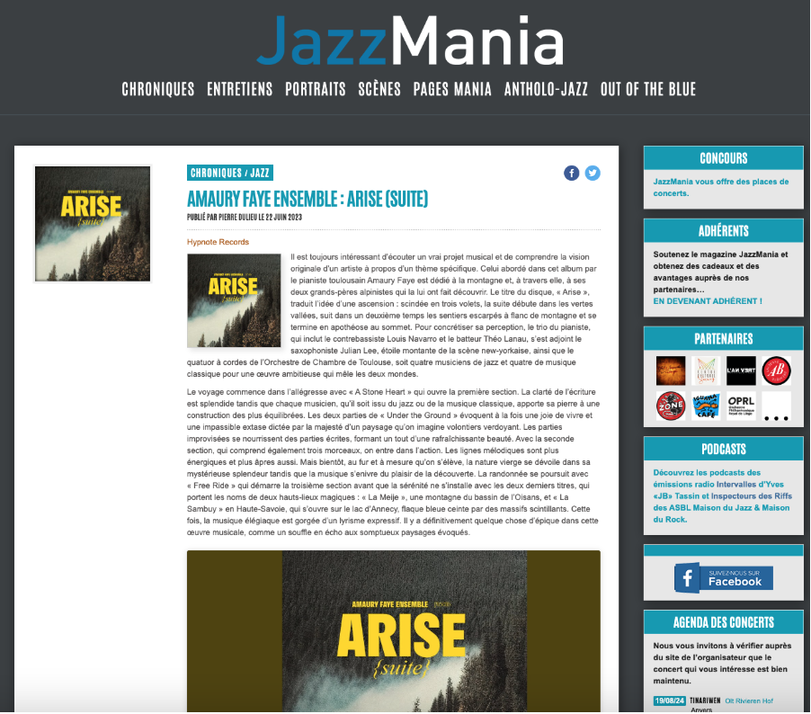 Dans cette critique, nous souhaitons partager nos impressions sur l’album ARISE par l’Amaury Faye Ensemble, disponible depuis le 19 mai 2023 sur toutes les plateformes de streaming et de téléchargement numérique. Cette œuvre musicale est un précieux mélange de jazz, de musique classique, de musiques de film et de modernité, offrant une expérience auditive exceptionnelle.