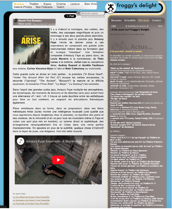 La liste des morceaux de ARISE présente des pièces captivantes et variées. Des titres comme A Stone Heart et Uprising se distinguent par des improvisations jazz de haute qualité et une énergie communicative, tandis que des morceaux comme Under The Ground et The Ancient sont plus contemplatifs et profonds, avec des mélodies émouvantes et des arrangements sophistiqués. La production de l’album est irréprochable, avec une attention particulière portée à la qualité sonore, qui met pleinement en valeur les performances des musiciens et les compositions d’Amaury Faye.