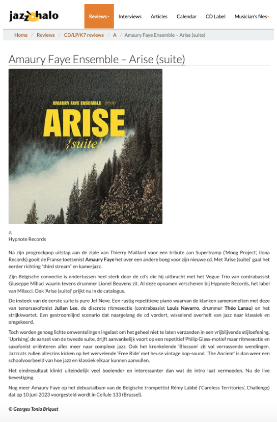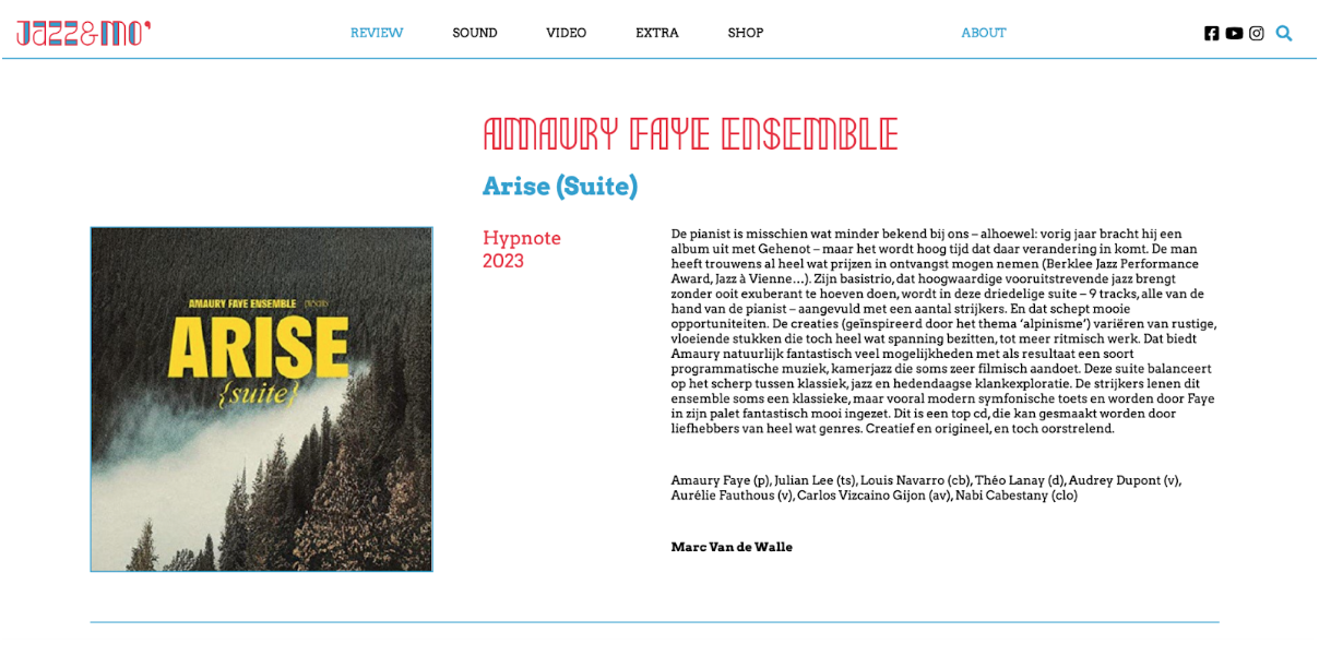 Dans Arise, Faye devient conteur et crée une narration qui capte l’attention du début à la fin. N’ayant pas peur de mêler différents styles et genres, il réunit un son plus « classique » — grâce au quatuor à cordes composé d’Audrey Dupont (violon), Aurélie Fauthous (violon), Carlos Vizcaíno Gijón (alto) et Nabi Cabestany (violoncelle) — et un style jazz contemporain avec le quartet de Julian Lee (saxophone ténor), Louis Navarro (contrebasse) et Théo Lanau (batterie).
