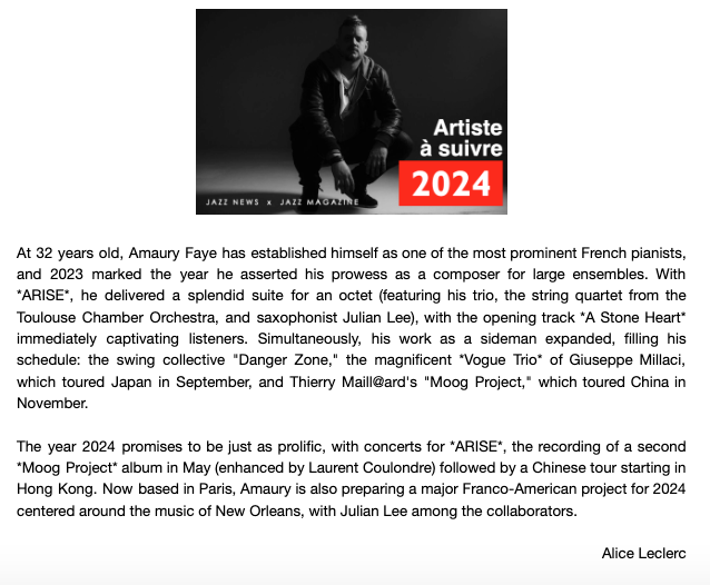 À 32 ans, Amaury Faye s’est imposé comme l’un des pianistes français les plus en vue, et l’année 2023 a marqué celle où il a affirmé son talent de compositeur pour de grands ensembles. Avec ARISE, il a livré une splendide suite pour octuor (composé de son trio, du quatuor à cordes de l’Orchestre de Chambre de Toulouse et du saxophoniste Julian Lee), la première pièce A Stone Heart captivant immédiatement l’auditeur. Parallèlement, son activité de sideman s’est intensifiée, remplissant son agenda : le collectif swing « Danger Zone », le magnifique Vogue Trio de Giuseppe Millaci, en tournée au Japon en septembre, et le « Moog Project » de Thierry Maillard, en tournée en Chine en novembre.