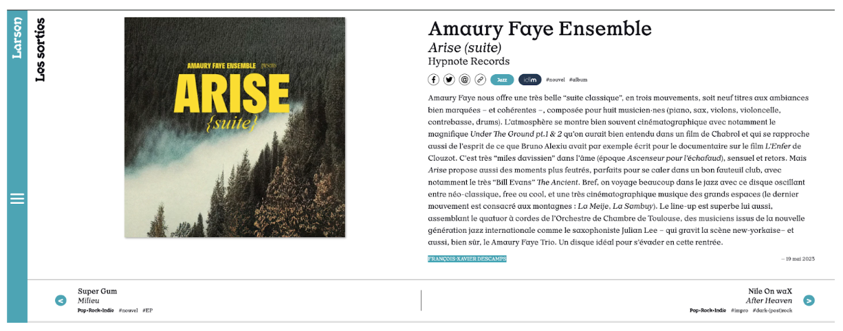 Cependant, Arise offre aussi des moments plus calmes, parfaits pour s’installer dans un fauteuil confortable, comme le très « Bill Evans » The Ancient. En somme, l’album emmène l’auditeur dans un voyage à travers le jazz, oscillant entre néoclassique, free et cool, avec un souffle très cinématographique des grands espaces (le dernier mouvement est dédié aux montagnes : La Meije, La Sambuy).